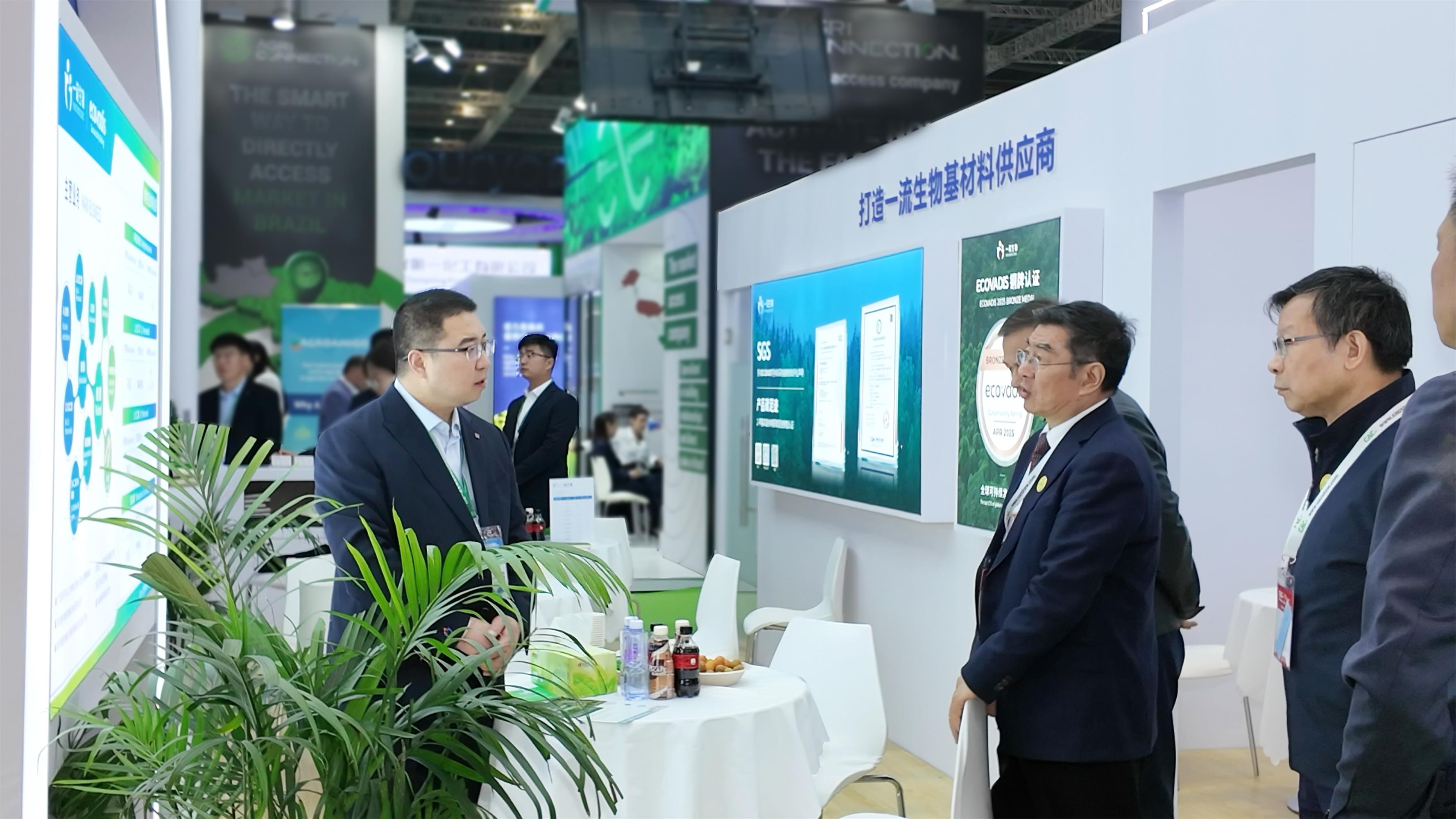 展會期間,中國石油和化學(xué)工業(yè)聯(lián)合會相關(guān)領(lǐng)導(dǎo)蒞臨一諾生物展位參觀指導(dǎo),并就綠色制造、生物基產(chǎn)業(yè)發(fā)展及產(chǎn)品應(yīng)用等話題與公司團(tuán)隊進(jìn)行了交流。圍繞行業(yè)發(fā)展趨勢、綠色低碳轉(zhuǎn)型路徑以及生物基產(chǎn)品的產(chǎn)業(yè)化方向,雙方展開了深入探討。這也讓我們更加深刻地感受到,綠色低碳與產(chǎn)業(yè)化實(shí)踐正成為行業(yè)持續(xù)關(guān)注的重要議題,而生物基路線在其中的價值也正在被進(jìn)一步看見。